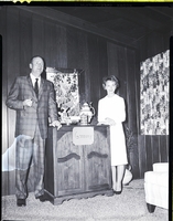 KEL 005 Mr. and Mrs. George Coiner stand beside a cabinet that has a sign reading "Germany" at a bon voyage party held in their honor before their trip to Europe. A painting, tea set, and doll sit on top of the cabinet.