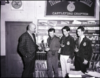 KEL 001 A first place team trophy is presented to the Castleford FFA team by Robert Carlson, representing Simplot Soilbuilders, left, at the South Magic Valley district FFA weed contest held in Castleford. FFA members are, from left to right, Devon Ruhter, Doral Brown, and Lowell Shaffer. Mr. Carlson is wearing a suit and tie, and the boys are wearing embroidered FFA jackets. A banner on the wall reads "Future Farmers of America Castleford Chapter" and a small plaque on the wall reads "Vocational FFA Agriculture."