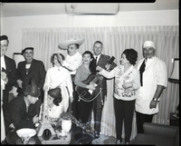 KEL 004 From left to right, Robert Bralisford, Mrs. Jerome Wilson, Jerome Wilson, Mrs. George Coiner, and George Coiner attend a bon voyage party held in honor of the Coiners before their trip to Europe. Mr. Bralisford is dressed in a French beret and stands behind a scale model of the Eiffel Tower. Mr. and Mrs. Wilson are dressed in Spanish costumes. Mr. Wilson wears a sombrero and plays a guitar. Mrs. Coiner is dressed in a white dress, and Mr. Coiner wears a suit and tie.