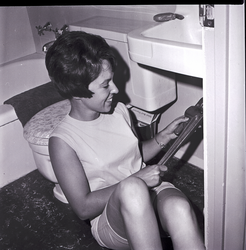- A member of the YWCA-sponsored Military Waiting Wives Club fixes a bathroom sink with a wrench. In the bathroom behind her is the toilet and bathtub.
