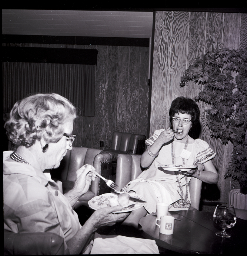 Two members of the Twin Falls County Democratic Women sit in chairs eating from plates of food at a potluck luncheon held in honor of Mrs. R.L. Summerfield at the home of Tommy Walker. Beside them is a round table, and on the table are some coffee cups and a clear goblet filled with water and floating flowers as a centerpiece. A small potted tree sits in the corner. Some empty chairs are scattered around the living room.