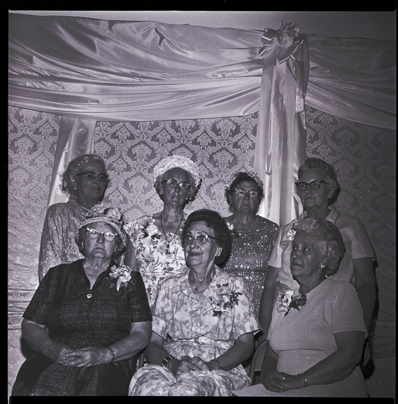 - A group of women dressed in dresses and corsages pose at the Canyonside Community Club Golden Anniversary social in Jerome at the Carillon. A drape hangs on the wall behind them.