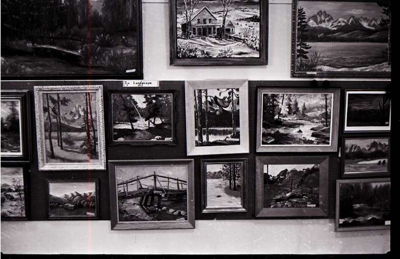 - A wall is covered in oil paintings of landscapes at the Gooding County Fair.