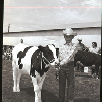 - A little boy dressed in a western plaid shirt and cowboy hat shows off his cow at the Lincoln County Fair. Behind him is a stable, and another cow is out on display. Several people stand along the side of the stable.