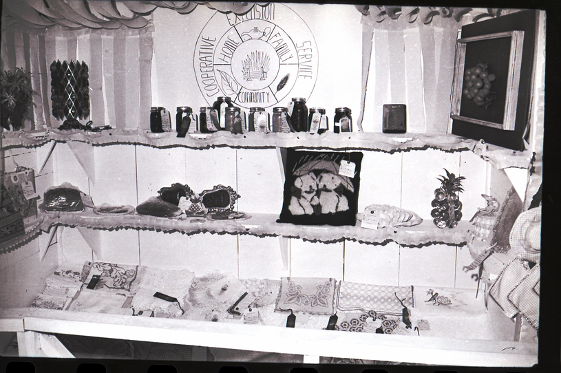 A booth for the extension council is on display at the Gooding County Fair. Inside the booth is a display of antiques, jar of canned preserves, loaves of bread and other foods, crafts, and embroidered cloth and pillows. Several of the items have award ribbons. At the back of the display is a sign that reads "Cooperative Extension Service, Home, Family, Community." Some banners decorate the top of the display.