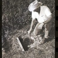 - A farmer inspects a pump hole filled with water that is part of a new irrigation system for a field near Jerome. He is dressed in a wide-brimmed hat. The crop field stretches out into the distance behind him.
