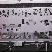 A booth for the Mod Squad 4-H Club is on display at the Jerome County Fair. The top of the display has a sign reading "Mod Squad 4-H Club" and a doll stands on the side of the display as a decoration. On the display is an informative sign about desserts, and below the sign several dessert food items are on display on plates. On the other side of the display are some yarn and knitting needle decorations, and on the table below are several folded clothing items. Several of the items on the display have award ribbons.