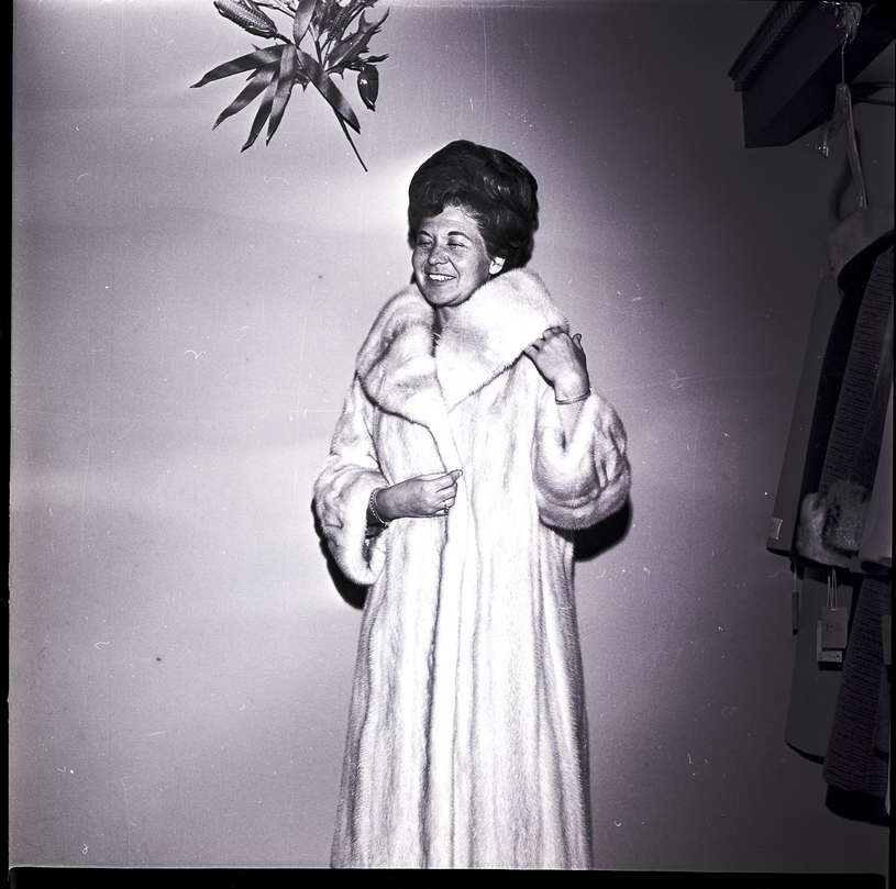 - Norma Herzinger models a long mink fur coat from Stefani Brothers Furs at The Mayfair Shop in Twin Falls. A leaf decoration hangs on the wall above her. To the right, several other coats dangle from hangers.