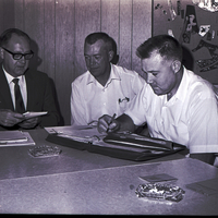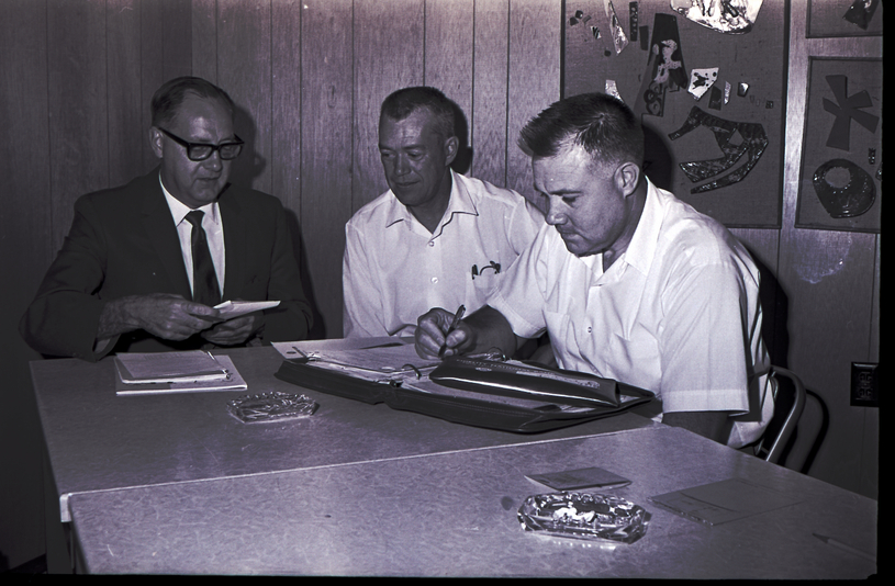 Planning activities for the next few months are the new officers of the Twin Falls Exchange Club. From left to right are Dr. Herb Burgess, president; Walt Thomas, vice president; and William Miller, secretary. They are seated around a table, looking over some notes. On the table are several notebooks, a three-ring binder, a zippered money pouch, and two ash trays. One of the men, dressed in a suit and tie, holds an envelope. Some art collages hang on the back wall.