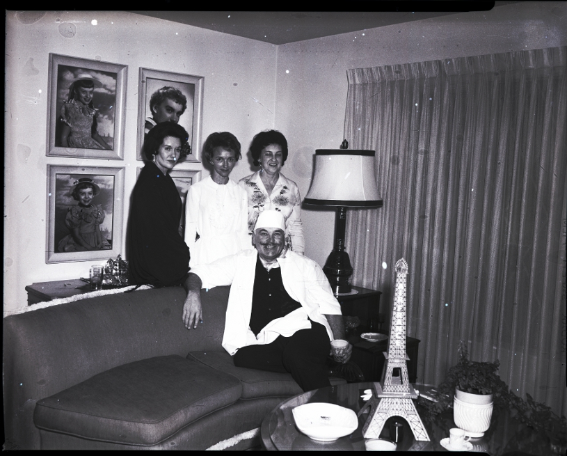 Mr. J. P. Seabeck, dressed in a Turkish fez hat, lounges on a couch at a bon voyage party held in honor of the Coiners before their trip to Europe. From left to right, Mrs. Jerome Wilson, Mrs. George Coiner, and Mrs. J. P. Seabeck stand behind the couch. A scale model of the Eiffel Tower sits on the table as a decoration.