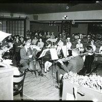 A string quartet plays "String Quartet No. 6" by Verrall for a crowd of people at the Twin Falls Federated Music Club's 14th annual White breakfast. On the left, Barry Hamilton plays a cello and Nancy Schow plays a violin. On the right David Hamilton and Kathy Holm play violins. Sitting in the background are past club presidents dressed in white dresses and hats with white rose corsages.
