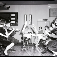 A string quartet plays "String Quartet No. 6" by Verrall for a crowd of people at the Twin Falls Federated Music Club's 14th annual White breakfast. On the right, Barry Hamilton plays a cello and Nancy Schow plays a violin. On the left David Hamilton and Kathy Holm play violins. Some attendees of the breakfast are seated around the players watching.