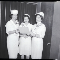 - From left to right, Mrs. Robert Carleson, Mrs. James Kinney, and Mrs. Donald Youtz, dressed in white dresses, corsages, and bonnets, examine the Double Award for Merit for "Parade of American Music" at the Twin Falls Federated Music Club's 14th annual White breakfast.