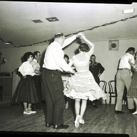 Dancing at a practice square dance session held at the Bairdatorium are Mr. and Mrs. Fred Shobe, foreground. In the background from left to right are Mrs. Joe Gibbs, Manley Hansen, Mrs. Larry Sabin, Larry Sabin, and Mr. and Mrs. Pat Warren. The women are dressed in full skirts. The caller, Bill Cofield, dressed in a cowboy hat and plaid shirt, is seen holding a microphone in the background. Streamers decorate the ceiling.