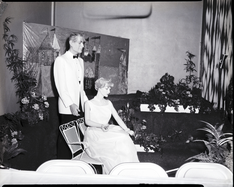 Decorations for the BPOE Ladies of the Elks Sweetheart Ball are on display. A woman mannequin in a dress and tiara sits on a bench, while a man mannequin in a tuxedo stands behind her. A backdrop of a painted castle is in the background. Several plants and flowers are placed around the scene.