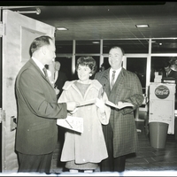 Mr. Jack Threlkeld, dressed in a suit and tie and coat and a woman, and Mrs. Threlkeld, dressed in a dress and fur coat, receive a program for the Dilettante Group of the Magic Valley's production of the musical "Can-Can," held at the Filer High School auditorium. The program reads "The Dilettante Group of the Magic Valley Presents Cole Porter's Can-Can." A vendor stands behind a Coca-Cola refreshment cart in the background.