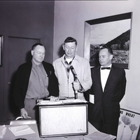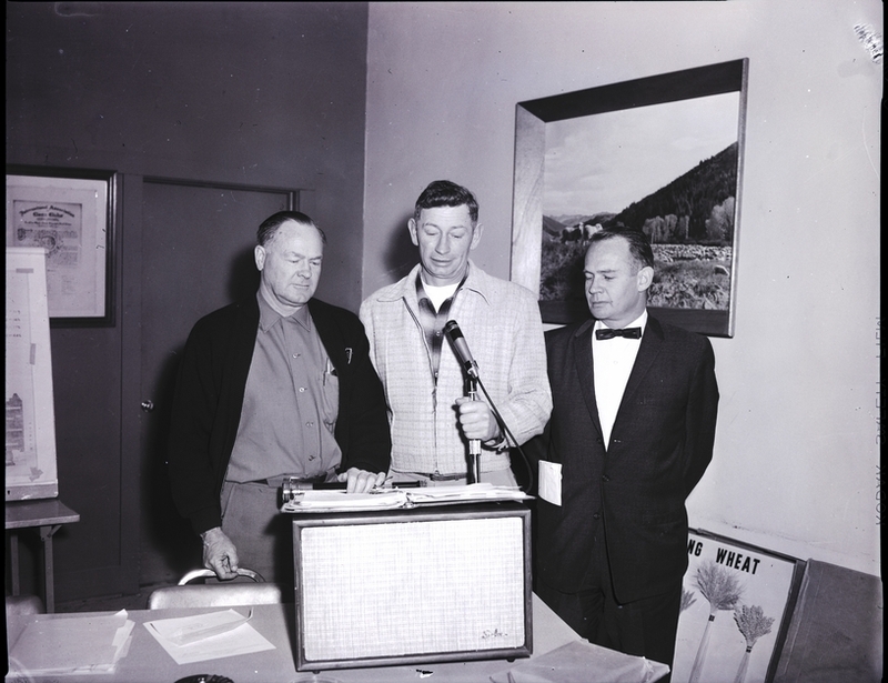 From left to right, Howard Roylance, extension agronomist, Charles Conrad, wheat producer, and Dr. Henry Fenwick, extension pathologist give a presentation for wheat producers held at the Rogerson Hotel in Twin Falls. Charles Conrad stands behind a microphone and explains the agenda for the wheat clinic studied by extension service
