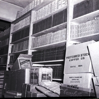 A storage room in the Twin Falls county court house is crowded with bookshelves filled with books, piles of books on the floor, and stacks of boxes filled with records. The microfilming of records with the new microfilm camera will save space in the office and enable the courthouse to keep more accurate and secure records.
