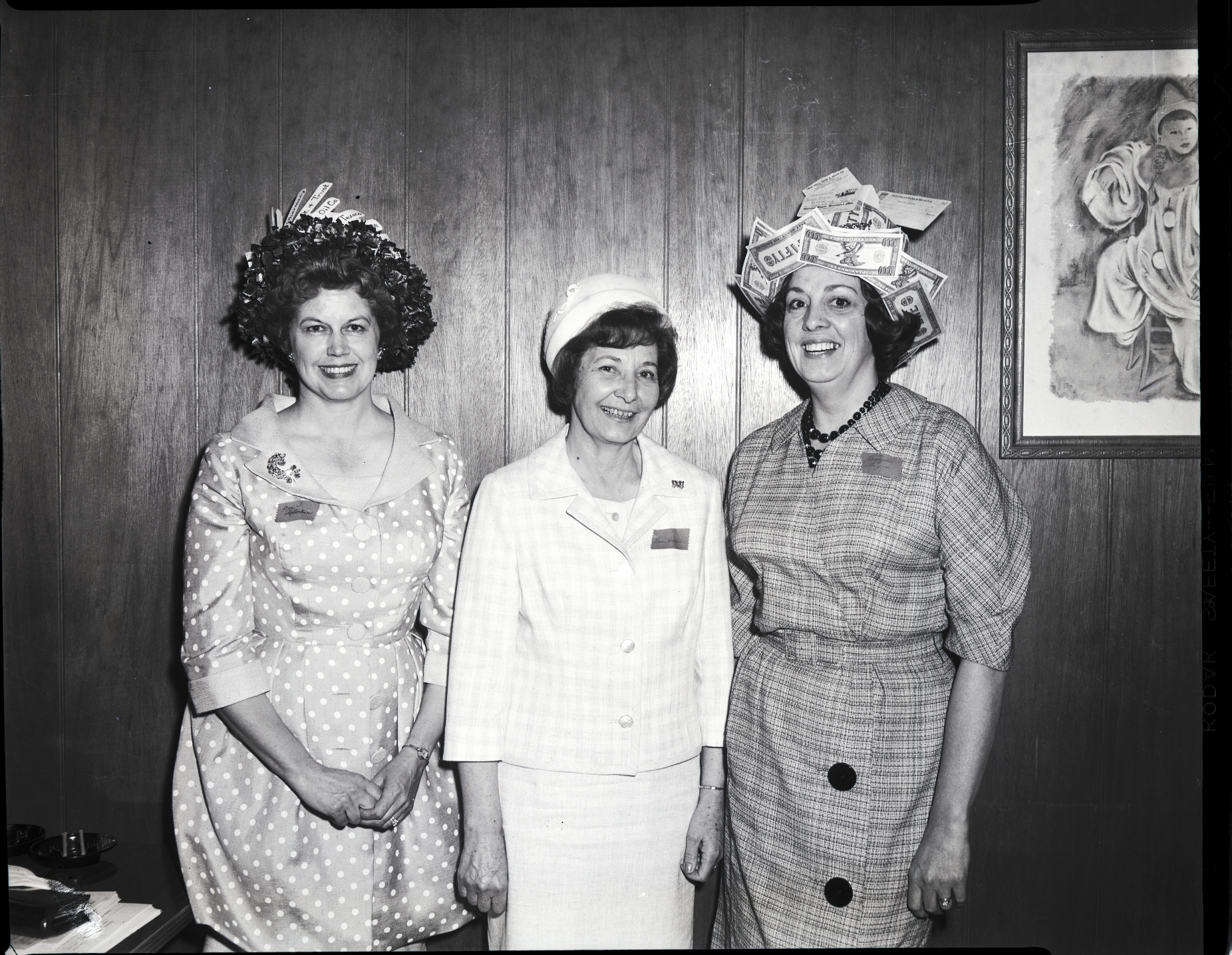 Attending the Welcome Wagon Newcomers Club April Fool's Day hat revue are, from left to right, Mrs. L. J. Robertson, president, Mrs. L. E. Hinton, Welcome Wagon hostess, and Mrs. Richard Dixon, out-going treasurer. Mrs. Robertson, dressed in a polka dot dress, wears a hat of black crepe paper with white signs sticking out of it reading "Pharmacy," "Bank & Trust," "Oil Co.," and "Texaco." Mrs. Hinton is dressed in a plaid dress suit and white bonnet. Mrs. Dixon, dressed in a striped dress, wears a hat covered in fake paper money and various bills and invoices. They are standing beside a table that has some ashtrays, paper, and a wallet on it. On the wall behind them hangs a painting of a clown.