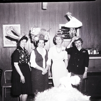 A group of original hat creations are modeled at the Welcome Wagon Newcomers Club April Fool's Day luncheon meeting held in the Depot Grill Caboose room. From left to right are Mrs. Wayne Robinson, Mrs. J. A. Milrany, Mrs. Phillip Whiting, and Mrs. Ed Goldade. Mrs. Robinson is wearing a black dress with a floral design on the top, and a hat with some bunny ears on it. Mrs. Milrany is wearing a plaid dress with a sailor style collar and a hat covered in balls of yarn and knitting needles. Mrs. Whiting is wearing a white dress and a hat with a clown resting under a paper umbrella on it. Mrs. Goldade is wearing a black shirt and plaid skirt and a hat of a crane figurine, holding a wrapped baby blanket in its mouth. The blanket reads "Destination Goldades." Several curled ribbons decorate the crane's head and tail. Some chairs and a grill with a counter top holding some salt shakers are in the background. A painting of a clown and a poster for smorgasbord hours hang on the wall behind them.