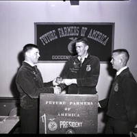 Outgoing Gooding chapter FFA president Joe Leeper hands a gavel to new chapter president Gene Wilkins. Randy Byers, state FFA vice president, observes the proceedings. They are dressed in suits and ties and their FFA embroidered jackets, and stand behind a podium reading "Future Farmers of America President." Behind the podium is a banner on the wall reading "Future Farmers of America Gooding."