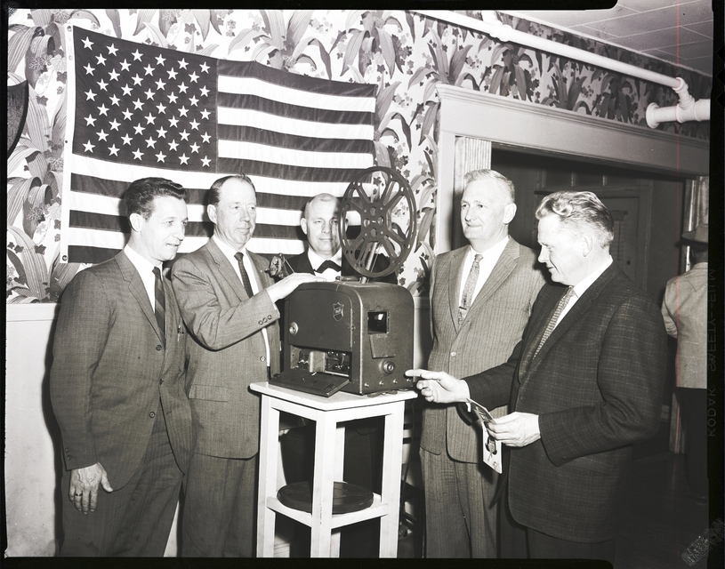 Attendees of the Idaho Cattle Feeder's Association meeting surround a film projector at a premier showing of a new movie produced by the Union Pacific Railroad, "Beef Rings the Bell," which featured many scenic range shots of the Stanley Basin area. From left to right are Sam Grayson, U.P. special representative, Boyd Baxter, U.P. agriculture agent, Ed Arnold, association president, Henry Jones, association director, and Russ Lindstrom, association director. An American flag is displayed on the wall behind the projector.