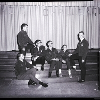 - New Kimberly FFA officers sit on a staircase. They are dressed in suits, ties, and FFA jackets. In attendance are Dennis Eslinger, Jim Klimes, Dennis M. Dean, and Loren Honstead.