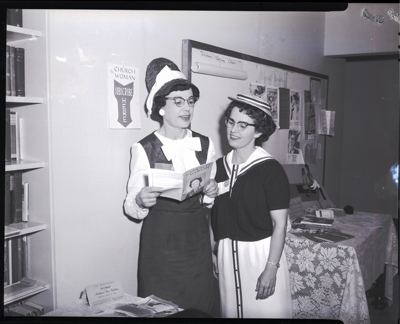 Speakers at the United Church Women's May Fellowship luncheon include, from left to right, Mrs. W. R. Hatcher, state president of the Christian Women's Fellowship and local magazine chairman for United Church Women, and Mrs. Richard Barton, local president of the United Church Women. They are wearing dresses and hats look at "The Church Woman" magazine in a hallway at the Church of the Brethren. A sign on the wall behind them reads "The Church Woman Subscribe Here." The table beside them have several copies of the pamphlet and a placard reading "Race - The New Challenge. 21st Annual Institute of Race Relations June 29 - July 11, 1964. Fisk University." A bookcase filled with books and a display table are in the background.