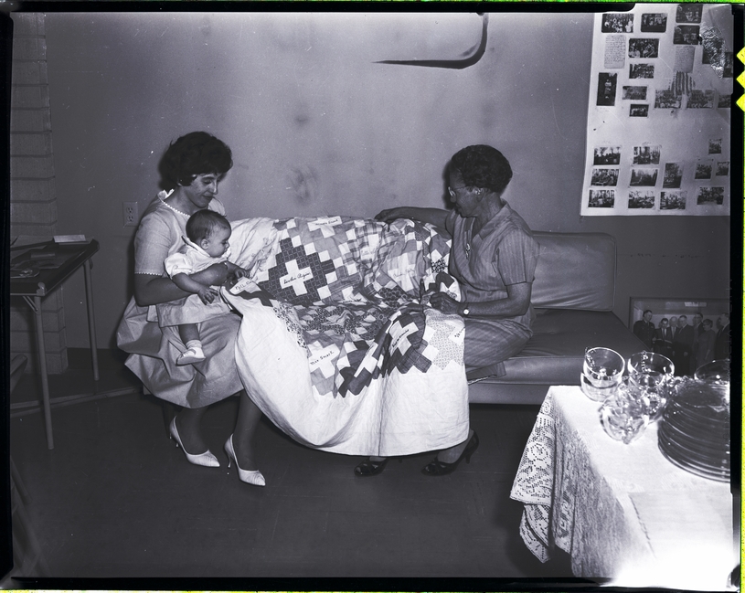 Displaying a quilt made by Morningside Club members in 1928 are, from left to right, Mrs. Farrell Peterson and baby daughter, Maria, and Mrs. Anthony Federico. Each block of the friendship quilt is embroidered with a club member's name. Visible names include "Nell Coctane," "Mae Smock," "Almeda Smock," "Dorothea Portgier," "Birdie Porter," and "Bird McCormick." The names "Ella" and "Verna" are also visible, but the last names are not. In the corner a table with a lace table cloth and plates and cups is visible. In the background is a poster board covered in photographs, and a framed photo of a group of people looking at a book.