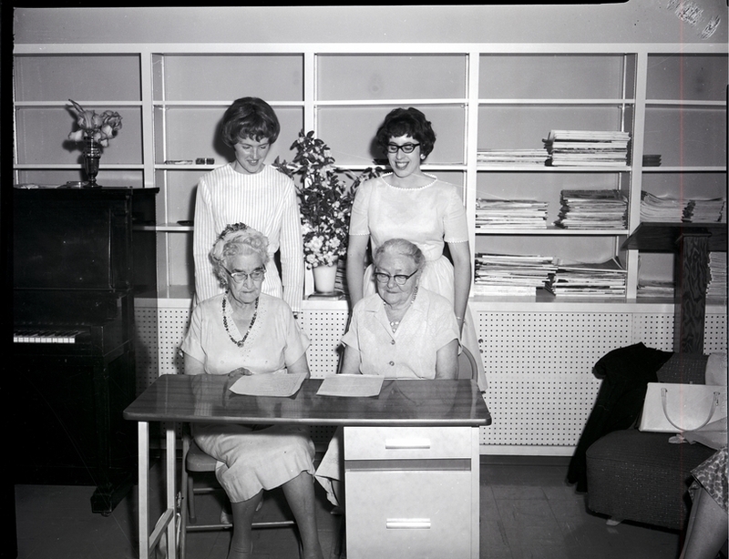 Representing the oldest and the youngest members of the Morningside Club are, standing from left to right, Mrs. Will Gurski and Mrs. Farrell Peterson, and seated from left to right, Mrs. Vera Holland and Mrs. Frances Osborn. They are all wearing dresses. On the table in front of them are secretaries' books containing the minutes of the meetings for the past 50 years. In the background are some book cases, a piano, some vases of flowers, a document stand, an a woman sitting on a couch.