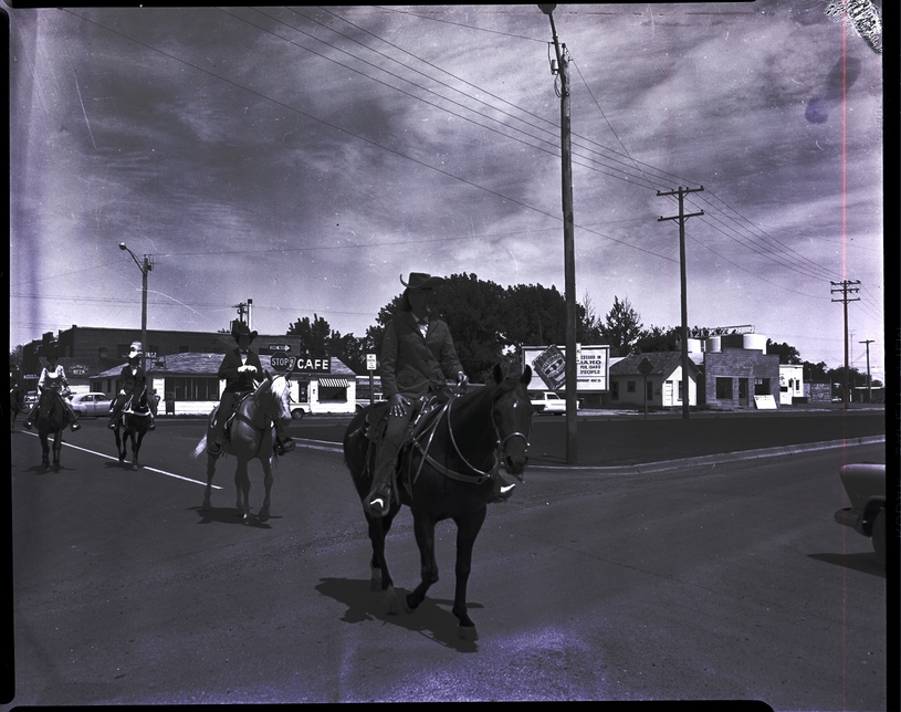 A procession of women on horses, dressed in cowboy hats and boots, ride down a street in the Magic Valley Western Horse Show Parade. 2nd Ave S. intersects behind the riders. The Blue Top Cafe and Blue Top Lounge are seen on the corner behind a one-way sign and stop sign. Behind it signs for The Blue Top Beer and City Floral are visible. Down the street is a large billboard reading "Falls Brand Skinless Wieners, Processed in Idaho for Idaho People, Independent Meat Co." A cafe, auto shop, and building with "A & B Plumbing and Heating" painted on the side are in the background. Several automobiles (cars) are seen on the street.