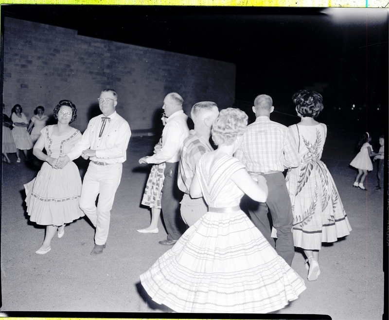 - Four men and four women in full skirts square dance outside together prior to the Idaho State Square Dance Festival. A group of three woman stand on the sidelines watching. A little girl and little boy dance together to the right, behind the square dancers.