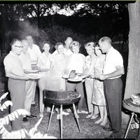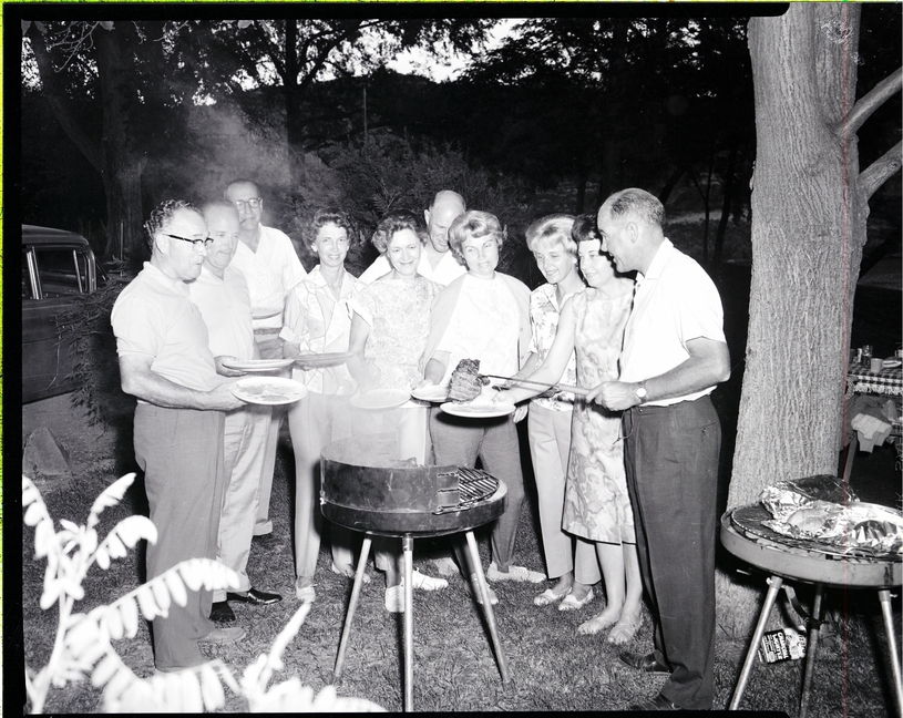 C. P. Parrish, right, serves a steak from a barbecue fork at the Supper Club steak fry held at Dierkes Lake. Surrounding the barbecue from left to right are Max Brown, Lloyd Thompson, Paul Beck, Mrs. Parrish, Mrs. Beck, Dr. George Rush, Mrs. Thompson, Mrs. Rush, and Mrs. Brown. Everyone holds their plates out, waiting to receive a steak. Several trees and bushes surround the area, and Dierkes Lake can be seen in the distance beyond the trees. A parked automobile (car) and a picnic table are in the background.