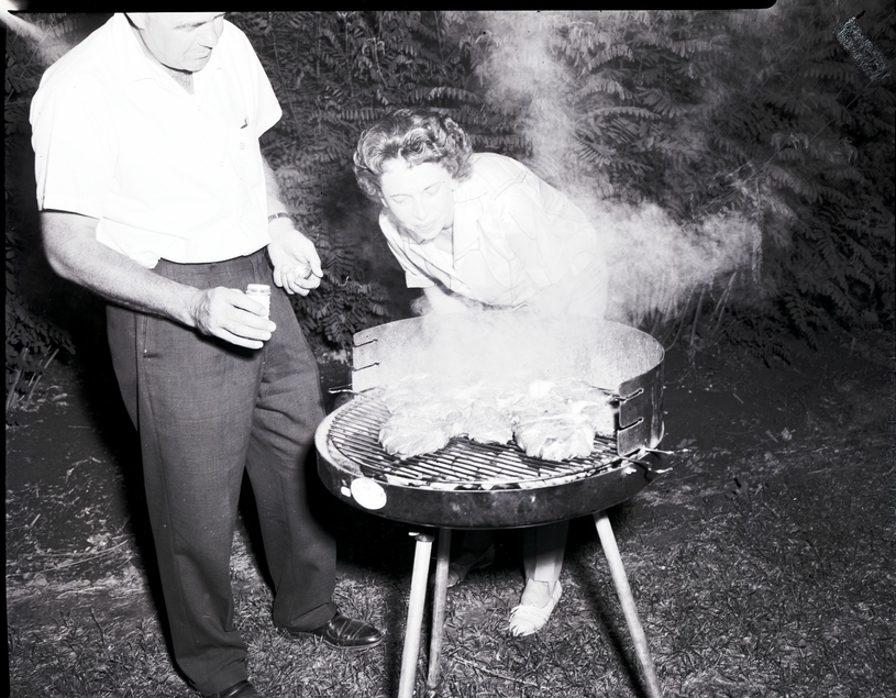 - C. P. Parrish stands beside a barbecue holding a bottle of seasoning at Dierkes Lake at a Supper Club barbecue. Mrs. C. P. Parrish stands over the barbecue grill, watching the steaks cook. Smoke billows up from the barbecue. Several trees and bushes surround the area.