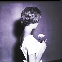 - Diana Drake, dressed in a white dress and holding a rose, shows off her short curly hairstyle from a profile view.