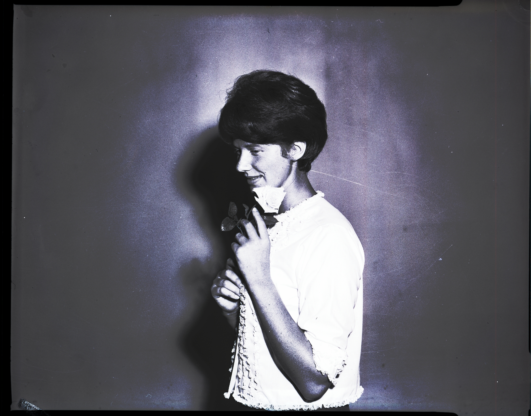 - Carolyln Beckenridge, dressed in a ruffled white shirt and dark skirt and holding a rose, shows off her short hairstyle from a profile view.