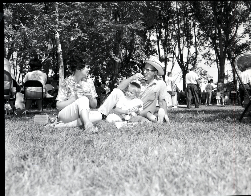 Mr. and Mrs. Weston Webb and their son Kevan sit on the grass eating fried chicken at the 18th Annual BPOE picnic. Mrs. Webb is wearing sunglasses, and Mr. Webb is wearing a cowboy hat. A purse sits on the ground next to Mrs. Webb. A group of people are gathered in the background, several sitting in folding chairs and lawn chairs under the shade of the trees.