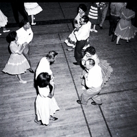 A group of square dancers dance in the Twin Falls High School gymnasium at the Idaho State Square Dance Festival. Four men and four women in full skirts dance as couples in the center of the floor, and other couples are seen dancing in the background around them.
