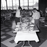 Square dancers attending the Idaho State Square Dance Festival enjoy a smorgasbord in the Twin Falls High School cafeteria. Several men and women help themselves to the buffet table, which has several bowls of salads, fried chicken, grapes, and bread, among other food items. Other dancers sit at the tables eating. Large windows show a sports field in the background.