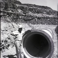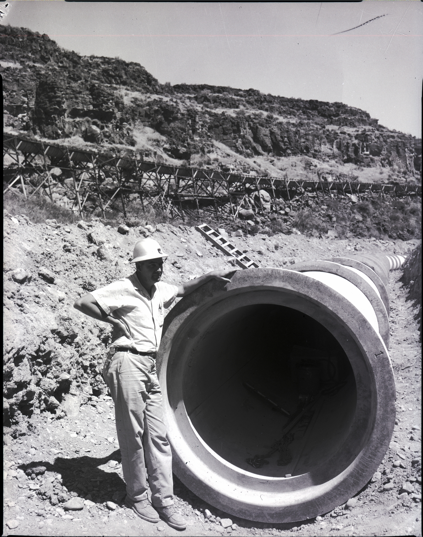 A man in a hard hat stands next to the opening of the large funnel of the Roseworth flume, which stretches through the desert landscape near Roseworth, Idaho. Several tools are resting inside the flume funnel. A wooden ladder rests against the cliff face to the side of the flume. In the background, the structure for the redirected water is visible. Rocks, shrubs, and sage brush cover the landscape.