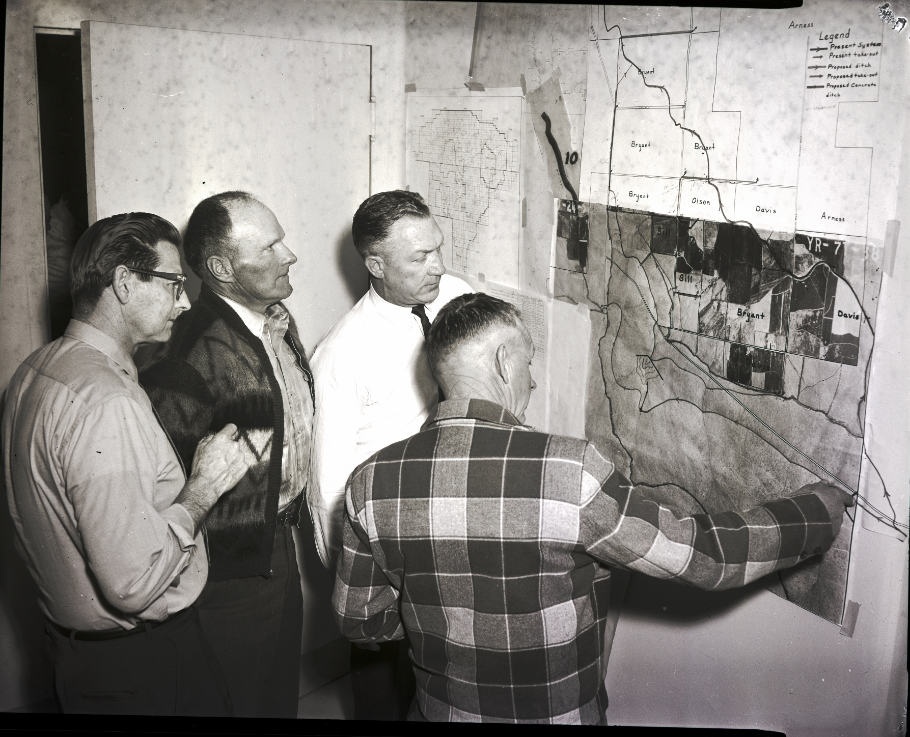 Proposed new canal alignment is discussed at the Twin Falls Soil Conservation district board of supervisors meeting. From left to right are Forest Clousner, area conservationist, Thurman Clark, Roseworth tract supervisor, Lee Morgan, state conservationist, and Lawrence Sill, Roseworth tract supervisor. Behind the men is a map broken into quadrants and labeled with the names "Bryant," "Olson," "Davis," "Sill," and "Arness." The legend in the corner of the map says "Present System," "Present take-out," "Proposed ditch," "Proposed take-out," and "Proposed concrete ditch."