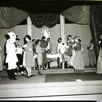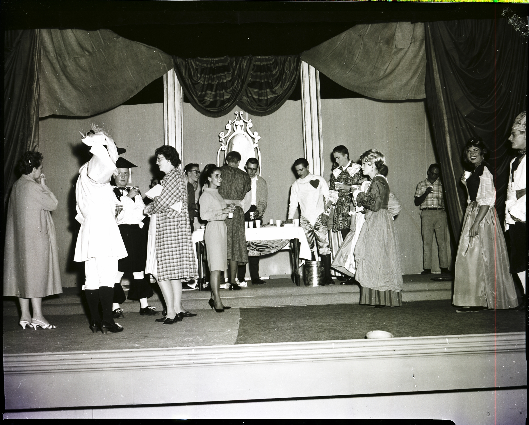 A group of actors dressed in various costumes and members of the audience stand on stage and help themselves to punch and cookies during the social following the "Bourgeois Gentleman" play in Buhl. A lattace, curtains, and cardboard props of a mirror and a castle facade decorate the stage. At the back of the stage is a refreshment table, and several of the actors are holding cups of punch.