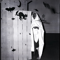 A woman dressed up in a demonic mask and a white shroud stands beside a cardboard outhouse at the Newcomers Couples Club Halloween Party held at the Rogerson Hotel. The cardboard outhouse is decorated with cut outs of a black cat that has "Toms" written on its side, a bat, and a moon. Spider and bat decorations hang from the ceiling. Skeleton decorations are on the wall in the background.