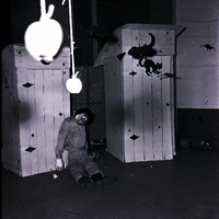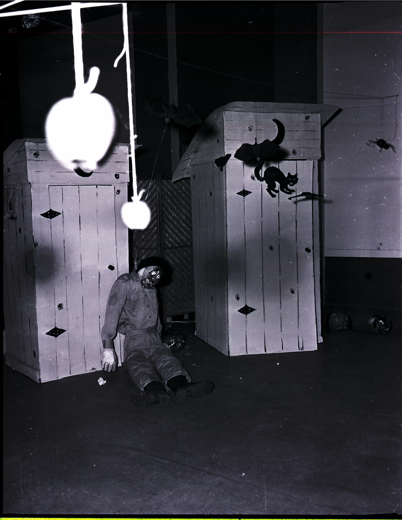 Several decorations are on display at the Newcomers Couples Club Halloween Party held at the Rogerson Hotel. Two cardboard outhouses decorated with cut outs of a black cat that has "Toms" written on its side, a bat, and a moon sit in the corner of a room. A dummy of a dead man sits on the floor in front of one of the cardboard houses. Some decorated pumpkins sit on the floor and some bats, spiders, and apples hang from the ceiling.