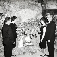Mr. and Mrs. H. L. Derrick, left, and Mr. and Mrs. Egon Kroll, right, admire a nativity set in the rock fireplace at a Christmas party at the Blue Lakes Country Club. Candy canes hang off the sculpture. The two men are dressed in suits and ties, and the two women are dressed in black dresses.