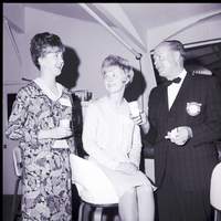 Chatting with Dale Henman, right, are Peggy Scott, left, and Sandra Simmons at a recent social at the Blue Lakes Country Club hosted for girls interested in becoming contestants in the Miss Twin Falls Pageant. Mr. Henman, dressed in a a suit and bow tie and Lions International badge and holding a cup and donut, is the entries chairman for the pageant, which is sponsored by the Twin Falls Lions Club. The women have curled hair and are wearing dresses and name tags.