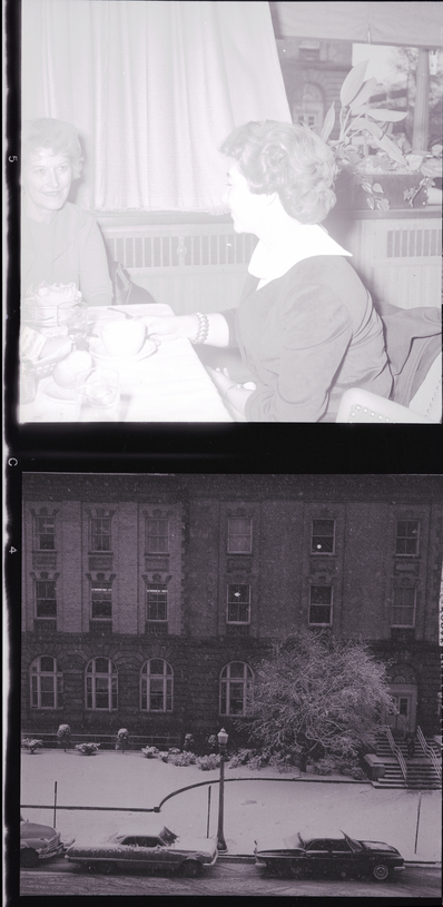 In the top photo, chatting during lunch at the Hotel Boise are, from left to right, Mrs. Norma Herzinger and Senator Mary Brooks. Various food items are on the table. In the background, some curtains blow in the breeze, and a potted plant sits on a window sill. A building can be seen outside the window. In the bottom photo, the Hotel Boise is seen from the outside. Some people are on the steps of the building, and some automobiles (cars) are parked along the street. Several trees and bushes are on the lawn. Snow covers the ground, trees, and cars.