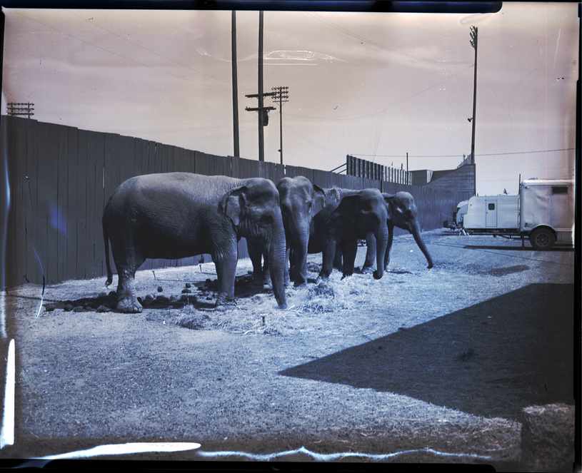 Four elephants stand outside eating hay while the William Kay-Shrine Circus is set up at Jaycee Park in Twin Falls. The circus was sponsored by the Magic Valley Shrine clubs. A fence runs behind them, and a trailer is in the background.