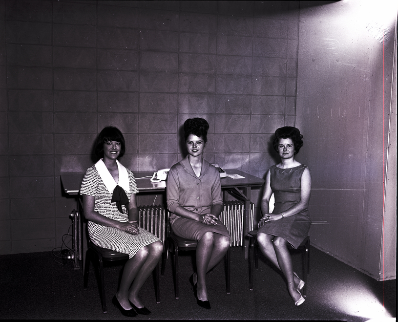- From left to right, Miss Twin Falls pageant candidates Jill Dunagan, Sherry Stuart, and Carol Christensen sit in chairs in front of a table. A telephone sits on the table. They are all wearing dresses.