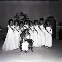 Cheryl Couch, winner of the Miss Twin Falls pageant, is seated and holding a bouquet of roses, while the other contestants stand behind her, including runners-up Pamela Jones and Deanna Peterson. The event was sponsored by the Twin Falls Lions Club and held at the Twin Falls High School gymnasium. All are dressed in formal gowns and sashes, and Cheryl Couch wears a tiara. Some potted plants, a statue holding a flower arrangement, an arched doorway, and a chair are in the background.